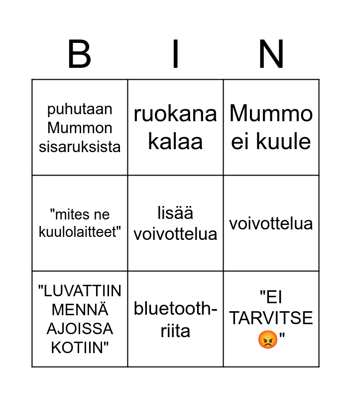 This bingo card has 9 words: "LUVATTIIN MENNÄ AJOISSA KOTIIN", Mummo ei kuule, ruokana kalaa, "mites ne kuulolaitteet", puhutaan Mummon sisaruksista, voivottelua, lisää voivottelua, "EI TARVITSE 😡" and bluetooth-riita.