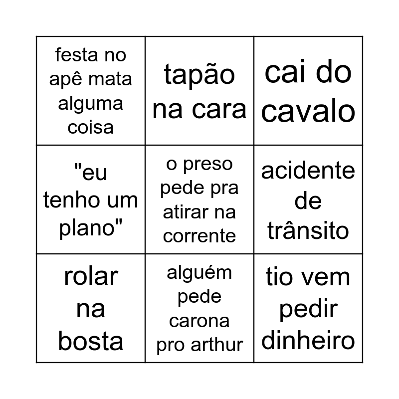 This bingo card has 15 words: acerta o chapéu, bate na árvore, cai do cavalo, festa no apê mata alguma coisa, alguém pede carona pro arthur, o preso pede pra atirar na corrente, LEENNYYY, falha do mouse, acidente de trânsito, tio vem pedir dinheiro, javier com o violão, "eu tenho um plano", rolar na bosta, tapão na cara and tiro no cu.