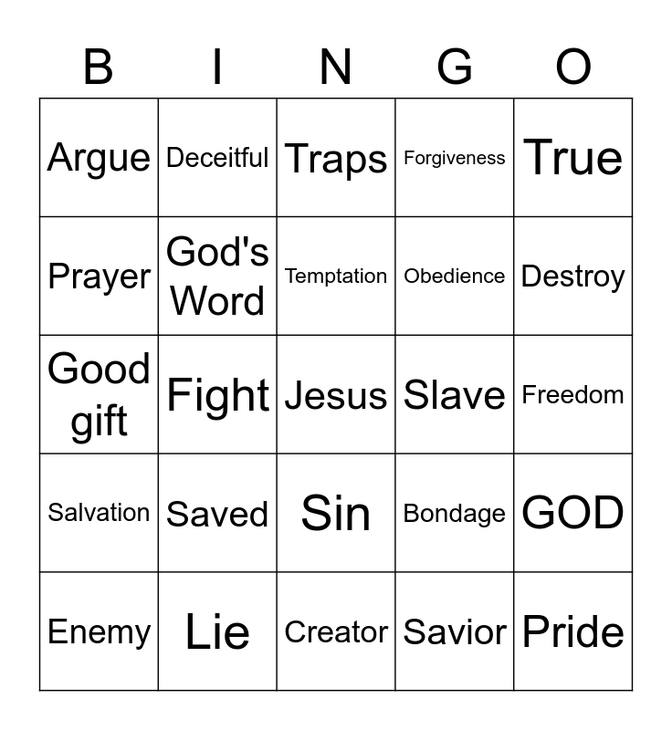 This bingo card has a free space and 24 words: Saved, Lie, Temptation, Enemy, True, Argue, Prayer, Deceitful, Slave, Sin, Obedience, Good gift, Bondage, GOD, God's Word, Savior, Freedom, Traps, Destroy, Fight, Pride, Salvation, Forgiveness and Creator.