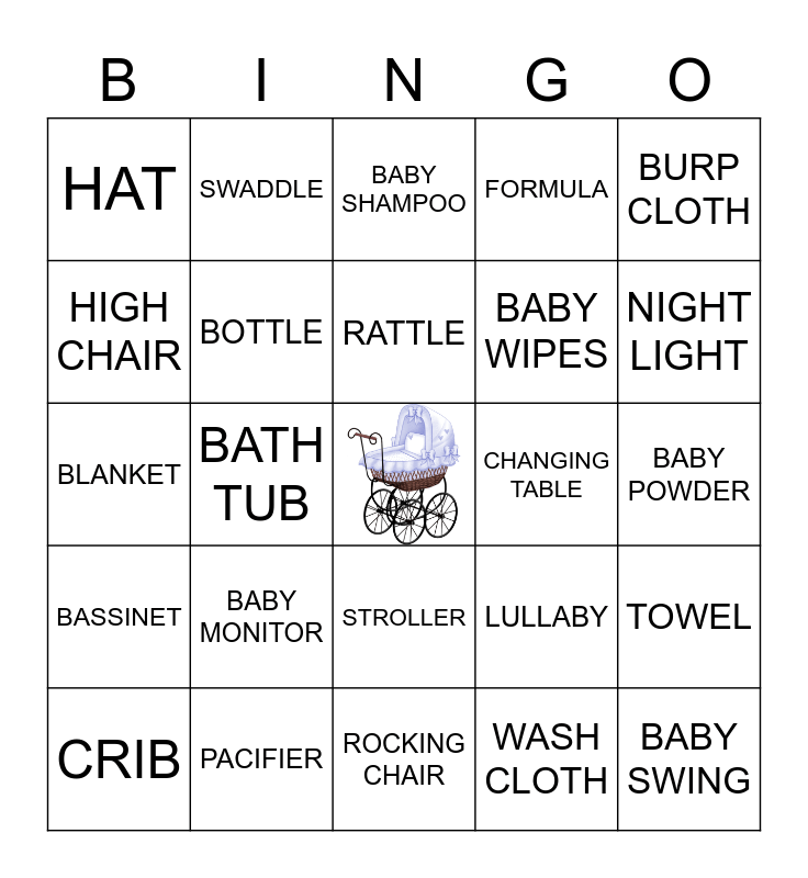This bingo card has a free space and 40 words: BIB, BLANKET, CAR SEAT, BOTTLE, PACIFIER, STROLLER, RATTLE, TEETHER, BURP CLOTH, BASSINET, BATH TUB, FORMULA, BABY SWING, BABY POWDER, CHANGING TABLE, BABY MONITOR, SOCKS, HAT, DIAPERS, BABY SHAMPOO, TOWEL, WASH CLOTH, BABY WIPES, HIGH CHAIR, BOOTIES, MOBILE, NURSERY, BOARD BOOKS, BOY, GIRL, STUFFED ANIMAL, CRIB, PACK AND PLAY, LULLABY, NIGHT LIGHT, ROCKING CHAIR, DIAPER BAG, ONESIE, SWADDLE and KISSES.