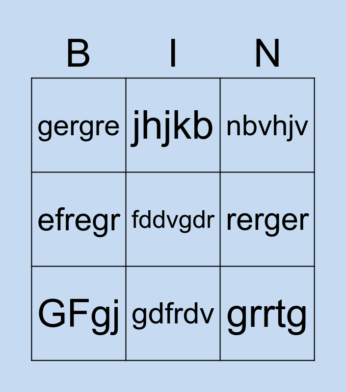 This bingo card has 9 words: GFgj, nbvhjv, jhjkb, efregr, gergre, rerger, fddvgdr, grrtg and gdfrdv.