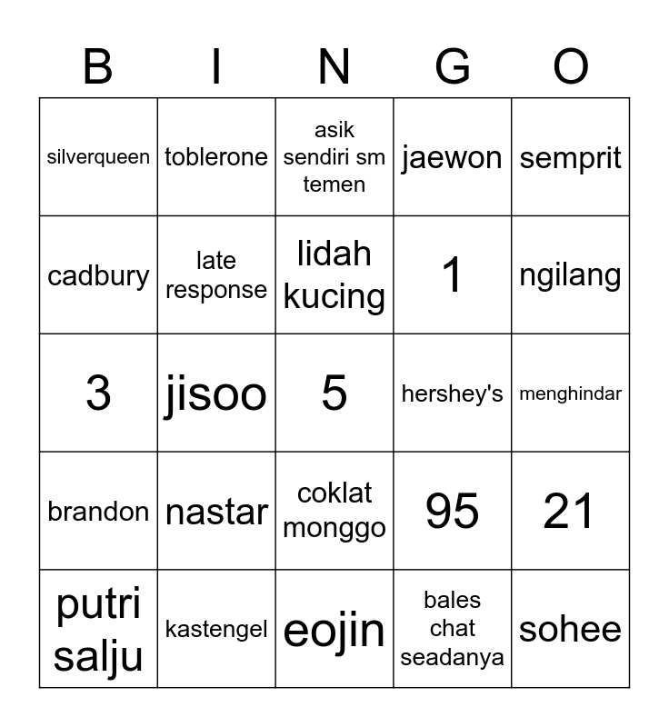 This bingo card has a free space and 24 words: nastar, kastengel, lidah kucing, putri salju, semprit, silverqueen, cadbury, toblerone, hershey's, coklat monggo, 1, 3, 95, 21, late response, bales chat seadanya, menghindar, asik sendiri sm temen, ngilang, jisoo, sohee, brandon, jaewon and eojin.