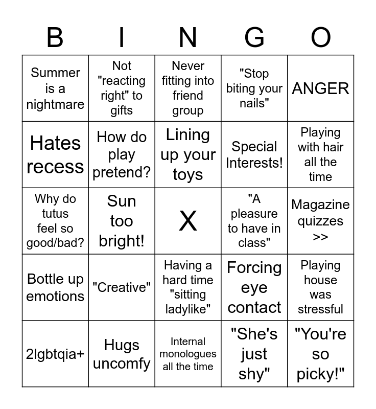 This bingo card has a free space and 24 words: "Creative", Hugs uncomfy, Lining up your toys, 2lgbtqia+, ANGER, Summer is a nightmare, Hates recess, Not "reacting right" to gifts, "A pleasure to have in class", Having a hard time "sitting ladylike", Special Interests!, Why do tutus feel so good/bad?, Forcing eye contact, Playing house was stressful, How do play pretend?, "She's just shy", Magazine quizzes >>, Never fitting into friend group, Playing with hair all the time, Sun too bright!, "You're so picky!", Bottle up emotions, "Stop biting your nails" and Internal monologues all the time.