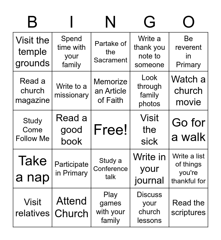 This bingo card has a free space and 29 words: Visit relatives, Work on family history, Read a good book, Sing Primary Songs, Visit the temple grounds, Partake of the Sacrament, Write to a missionary, Participate in Primary, Visit the sick, Attend Church, Go for a walk, Read the scriptures, Play games with your family, Discuss your church lessons, Watch a church movie, Visit your Grandparents, Study a Conference talk, Take a nap, Be reverent in Primary, Study Come Follow Me, Write in your journal, Prepare a FHE lesson, Look through family photos, Read a church magazine, Write a thank you note to someone, Spend time with your family, Write a list of things you're thankful for, Memorize an Article of Faith and Learn about some of our temples.