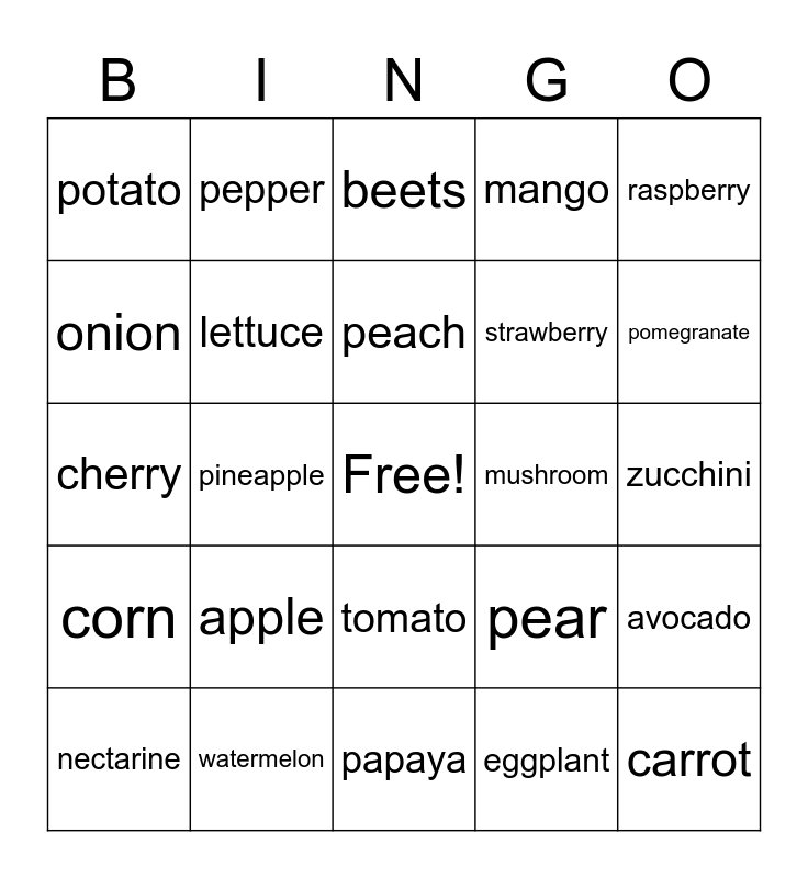 This bingo card has a free space and 24 words: apple, watermelon, peach, nectarine, raspberry, potato, onion, pepper, mushroom, tomato, strawberry, cherry, pear, avocado, lettuce, eggplant, zucchini, beets, pomegranate, pineapple, carrot, corn, mango and papaya.