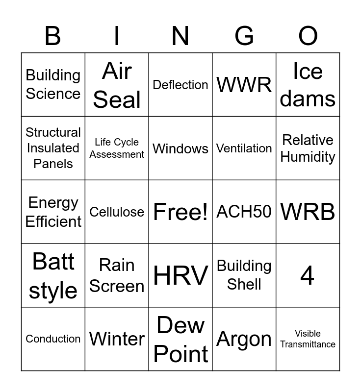 This bingo card has a free space and 44 words: U-factor, Visible Transmittance, SHGC, Conduction, High, Argon, Deflection, R-value, Ice dams, Winter, WWR, ACH50, HRV, Rain Screen, Impervious, Dew Point, Asphalt Shingles, Energy Efficient, 5, Relative Humidity, Air Seal, Convection, Radiation, Building Science, Drying, WRB, Building Envelope, Building Enclosure, Building Shell, Batt style, 6, 4, Polyiso, Air Pockets, Cellulose, Passive House, NFRC, Advanced, Windows, Structural Insulated Panels, Ventilation, Stack, Life Cycle Assessment and Embodied Energy.