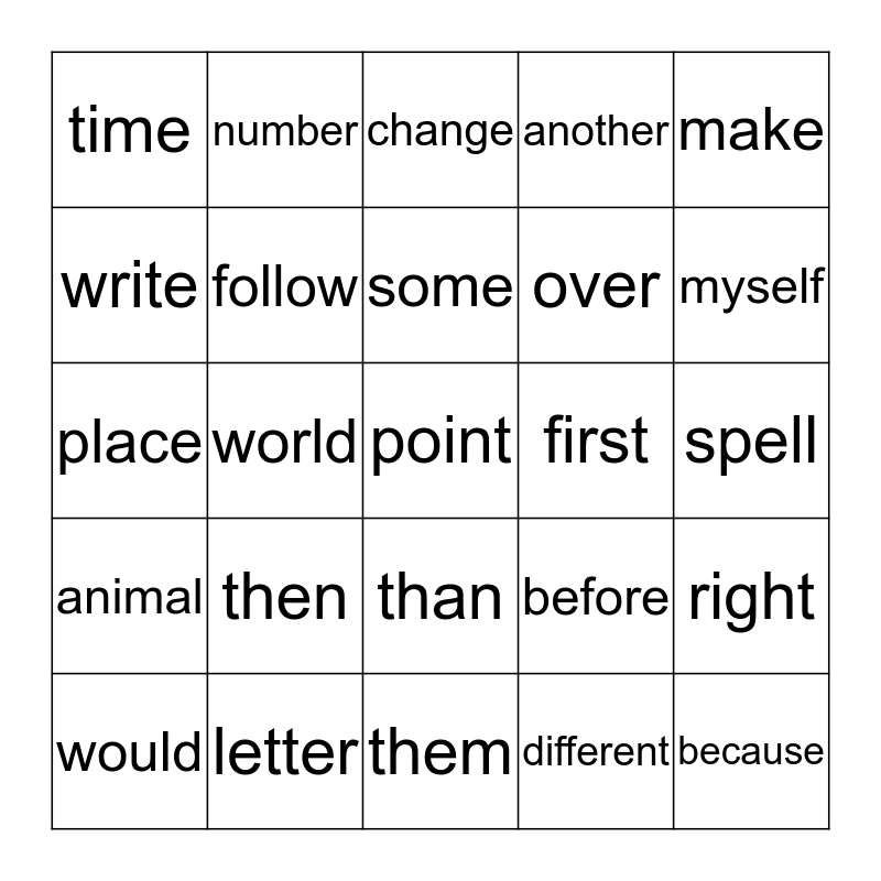 This bingo card has 25 words: then, them, some, would, make, time, write, number, first, than, over, place, before, right, follow, because, spell, change, myself, world, point, letter, animal, another and different.
