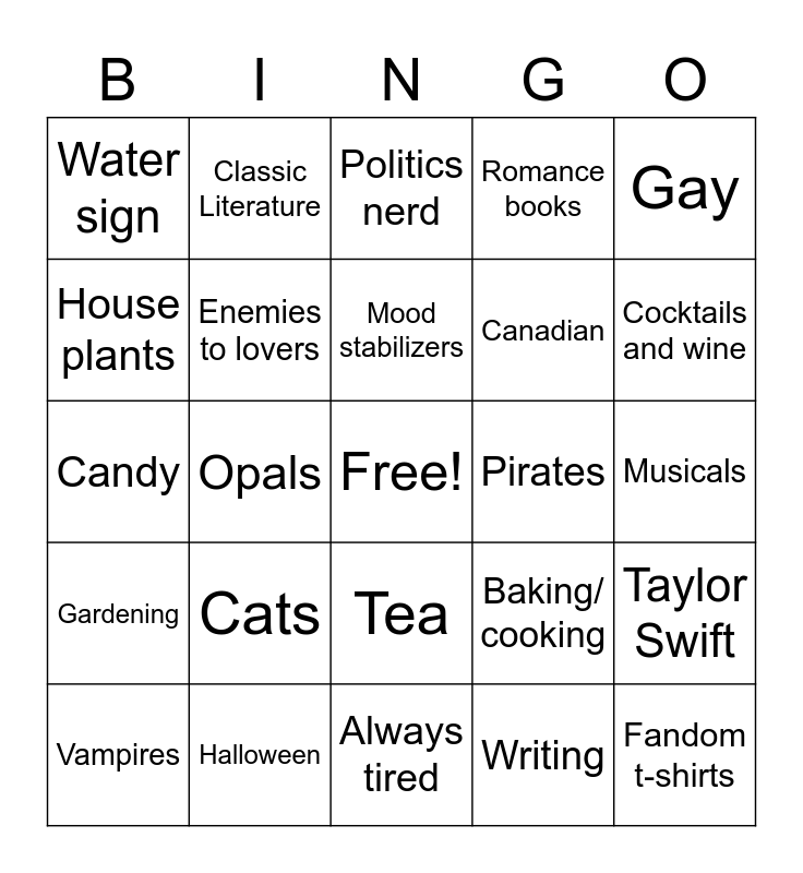 This bingo card has a free space and 24 words: Cats, Halloween, Mood stabilizers, Vampires, Gay, Water sign, House plants, Classic Literature, Pirates, Tea, Canadian, Candy, Baking/ cooking, Taylor Swift, Enemies to lovers, Writing, Musicals, Politics nerd, Cocktails and wine, Opals, Fandom t-shirts, Gardening, Romance books and Always tired.