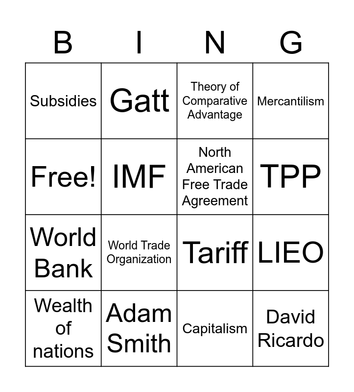 This bingo card has 16 words: Adam Smith, LIEO, Theory of Comparative Advantage, Subsidies, World Bank, Gatt, Tariff, Capitalism, Free!, IMF, Wealth of nations, Mercantilism, World Trade Organization, TPP, North American Free Trade Agreement and David Ricardo.