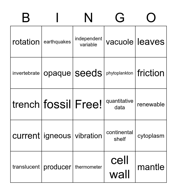 This bingo card has a free space and 24 words: igneous, producer, seeds, translucent, leaves, rotation, invertebrate, earthquakes, quantitative data, vibration, phytoplankton, trench, continental shelf, cytoplasm, opaque, cell wall, renewable, independent variable, friction, fossil, mantle, current, vacuole and thermometer.