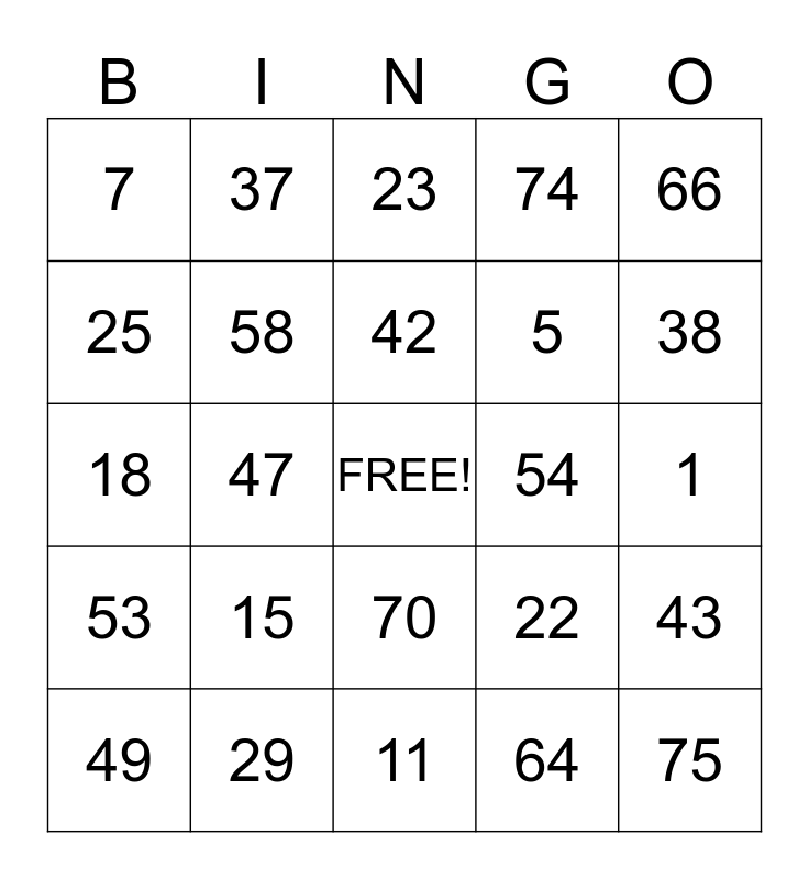 This bingo card has a free space and 24 words: 15, 29, 42, 49, 66, 7, 25, 37, 54, 70, 5, 18, 22, 43, 58, 64, 1, 23, 38, 47, 75, 53, 74 and 11.