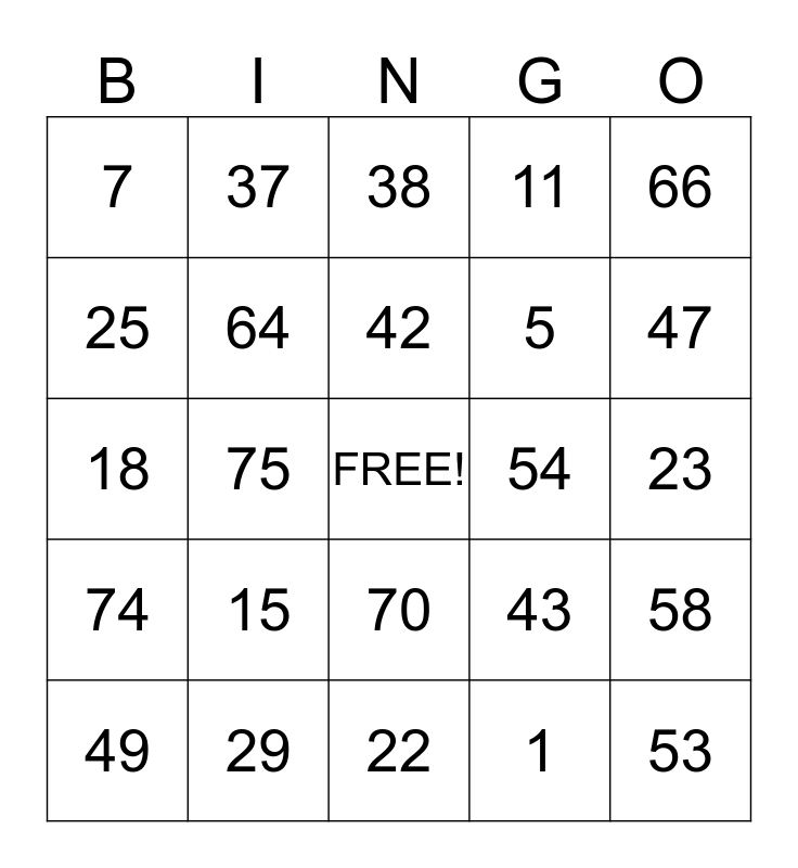 This bingo card has a free space and 24 words: 15, 29, 42, 49, 66, 7, 25, 37, 54, 70, 5, 18, 43, 58, 64, 1, 23, 38, 47, 75, 53, 74, 11 and 22.