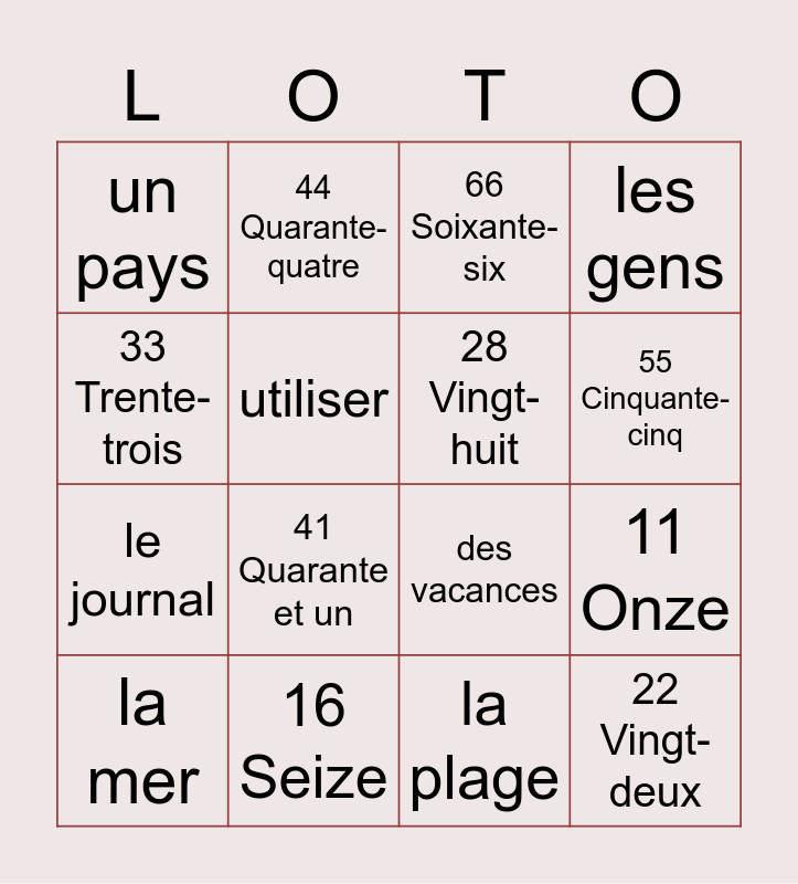 This bingo card has 33 words: 0 Zéro, 3 Trois, 11 Onze, 17 Dix-sept, 22 Vingt-deux, 28 Vingt-huit, 33 Trente-trois, 39 Trente-neuf, 44 Quarante-quatre, 50 Cinquante, 55 Cinquante-cinq, 66 Soixante-six, 21 Vingt et un, 2 Deux, 16 Seize, 41 Quarante et un, un ticket de métro, des vacances, un vol, à l'étranger, le monde, une capitale, un pays, la plage, bronzer, la mer, les gens, le journal, utiliser, un avion, une arrivée, un départ and faire un voyage.