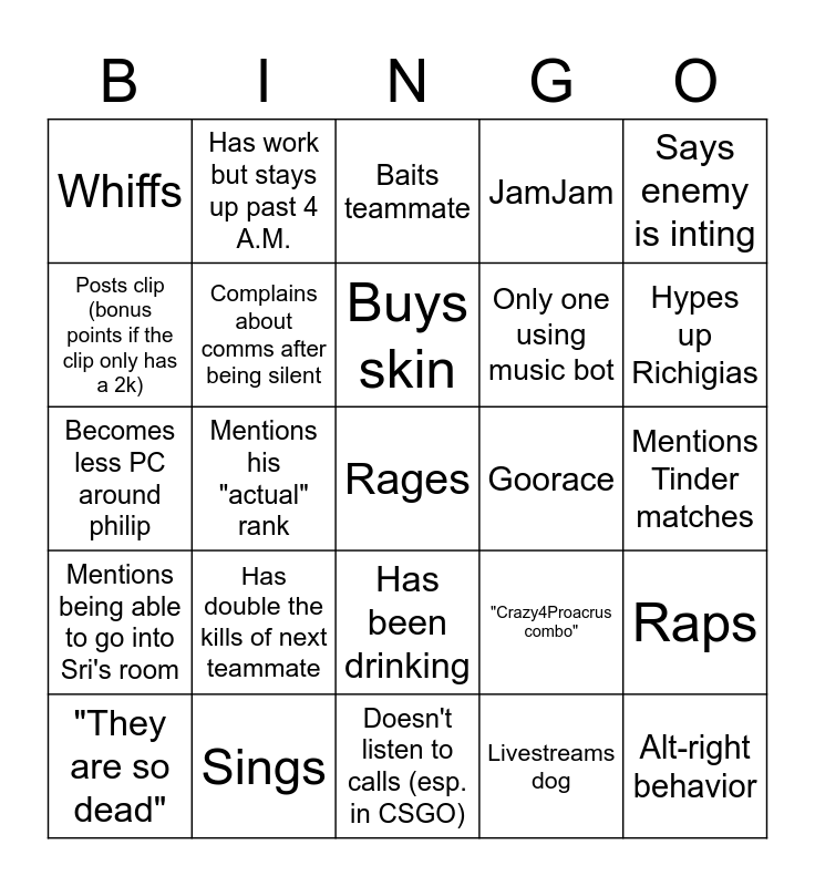 This bingo card has a free space and 29 words: "They are so dead", "Ironically" does the Sinatraa voice, Mentions his "actual" rank, Complains about enemy not peeking, Whiffs, Baits teammate, Complains about comms after being silent, Has double the kills of next teammate, Goorace, Sings, Mentions Tinder matches, Alt-right behavior, Doesn't listen to calls (esp. in CSGO), Livestreams dog, Hypes up Richigias, AFK's without explanation, Has been drinking, Mentions being able to go into Sri's room, Says enemy is inting, Becomes less PC around philip, "Crazy4Proacrus combo", Says something in Japanese, Only one using music bot, Posts clip (bonus points if the clip only has a 2k), JamJam, Has work but stays up past 4 A.M., Raps, Buys skin and "Col. Mangoes Dabisi".