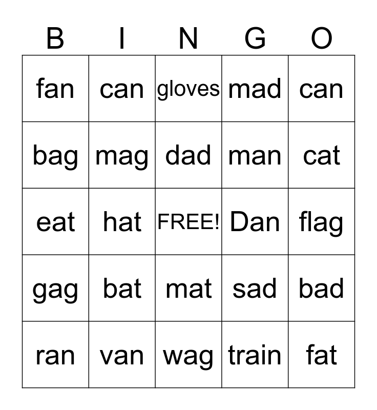 This bingo card has a free space and 24 words: bat, van, dad, ran, can, fan, bag, can, Dan, mat, man, eat, sad, bad, mag, train, flag, gloves, cat, hat, fat, gag, mad and wag.