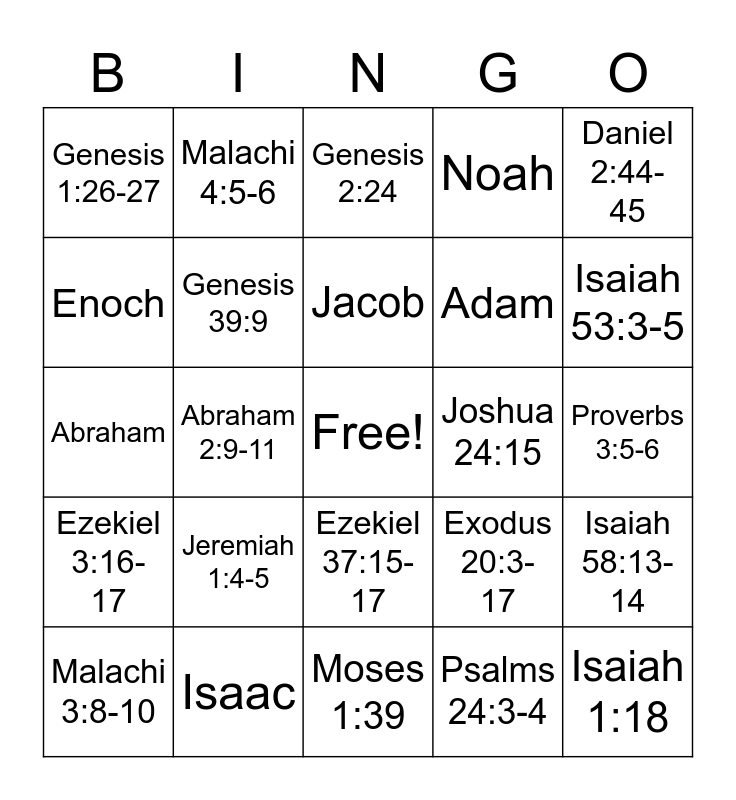 This bingo card has a free space and 31 words: Moses 1:39, Moses 7:18, Abraham 2:9-11, Abraham 3:22-23, Genesis 1:26-27, Genesis 2:24, Genesis 39:9, Exodus 20:3-17, Joshua 24:15, Psalms 24:3-4, Proverbs 3:5-6, Isaiah 1:18, Isaiah 5:20, Isaiah 29:13-14, Isaiah 53:3-5, Isaiah 58:6 - 7, Isaiah 58:13-14, Jeremiah 1:4-5, Ezekiel 3:16-17, Ezekiel 37:15-17, Daniel 2:44-45, Amos 3:7, Malachi 3:8-10, Malachi 4:5-6, Adam, Enoch, Noah, Abraham, Isaac, Jacob and Joseph.