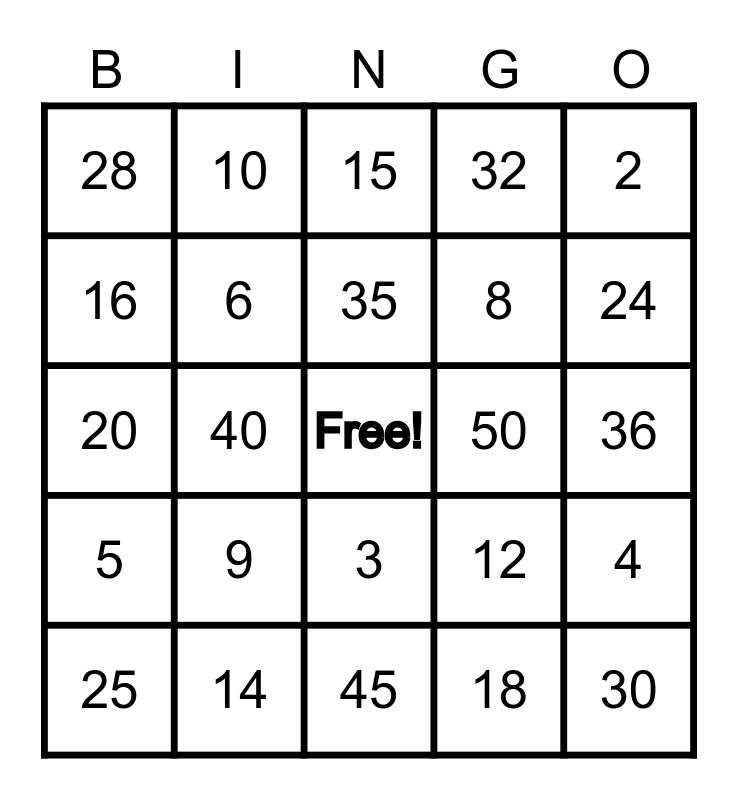 This bingo card has a free space and 25 words: 25, 9, 35, 18, 24, 28, 10, 15, 8, 4, 20, 6, 12, 30, 16, 14, 45, 32, 36, 5, 40, 3, 50, 2 and Free.