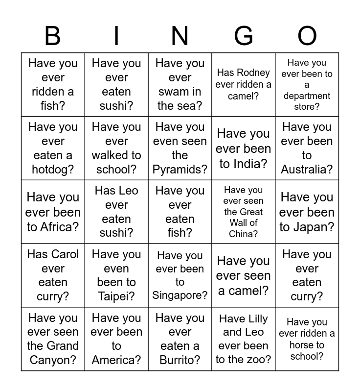 This bingo card has 25 words: Have you even been to Taipei?, Have you ever eaten a Burrito?, Have you even seen the Pyramids?, Have you ever seen the Grand Canyon?, Have you ever been to a department store?, Have you ever ridden a fish?, Have you ever eaten a hotdog?, Have you ever eaten sushi?, Have you ever seen the Great Wall of China?, Have you ever been to Singapore?, Have you ever been to India?, Have you ever been to Africa?, Have you ever seen a camel?, Have you ever eaten curry?, Have you ever walked to school?, Have you ever ridden a horse to school?, Have you ever been to Japan?, Have you ever swam in the sea?, Have you ever been to Australia?, Has Leo ever eaten sushi?, Have you ever eaten fish?, Have you ever been to America?, Has Carol ever eaten curry?, Has Rodney ever ridden a camel? and Have Lilly and Leo ever been to the zoo?.