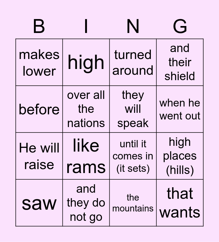 This bingo card has 42 words: Free!, when he went out, was, his holy place, his rulership, the sea, saw, and it fled, turned around, backward, the mountains, like rams, high places (hills), before, who turns over, servants, from the Rising Sun, until it comes in (it sets), praised, high, over all the nations, His honour, who is on High, makes lower, He lifts up, from the dust, He will raise, to return, His nation, the sons, Who has remembered us, that wants, they will speak, they do not see, ears, and they do not hear, and they do not smell, and they do not go, like them, their strength, and their shield and trust.