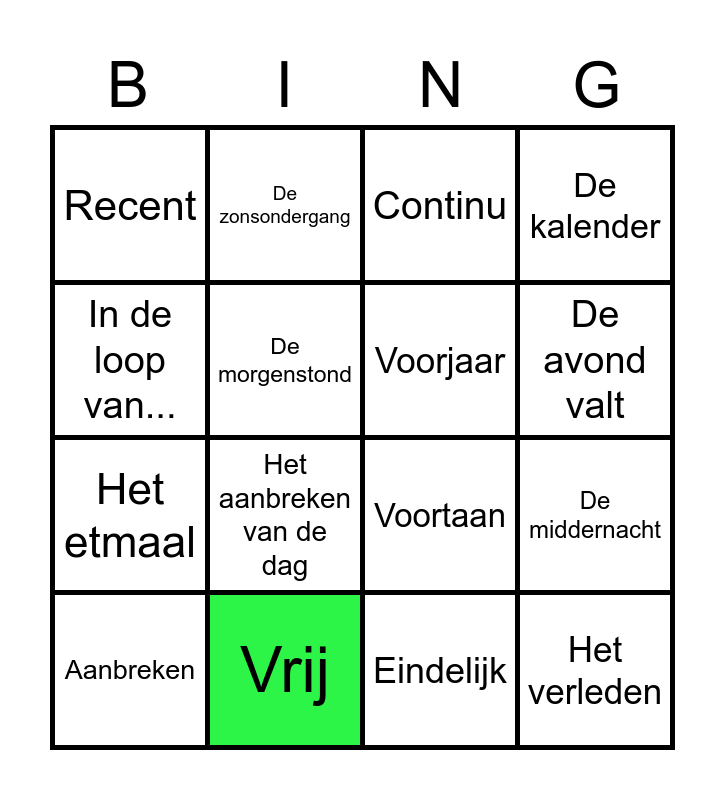 This bingo card has 21 words: Vrij, Verlopen, De zonsondergang, De zonsopkomst, Eindelijk, Voorjaar, Recent, Continu, Voortaan, De avond valt, Het etmaal, De kalender, Het verleden, Het jaartal, De morgenstond, Na verloop van tijd, Aanbreken, Het aanbreken van de dag, In de loop van..., De middernacht and Op den duur.