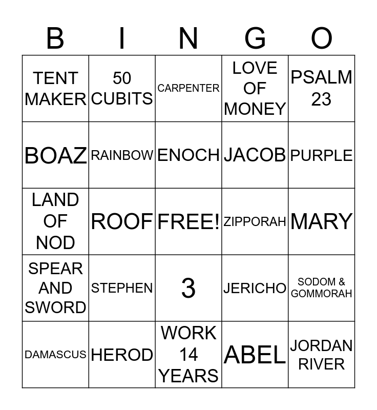This bingo card has a free space and 24 words: STEPHEN, HEROD, ENOCH, DAMASCUS, PSALM 23, TENT MAKER, BOAZ, 50 CUBITS, ZIPPORAH, 3, JACOB, LAND OF NOD, JERICHO, SODOM & GOMMORAH, RAINBOW, ABEL, MARY, CARPENTER, PURPLE, ROOF, JORDAN RIVER, SPEAR AND SWORD, LOVE OF MONEY and WORK 14 YEARS.