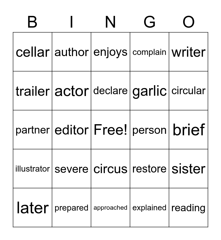 This bingo card has a free space and 24 words: severe, prepared, declare, later, writer, cellar, trailer, author, person, circus, garlic, partner, restore, sister, actor, explained, brief, enjoys, circular, editor, reading, illustrator, complain and approached.
