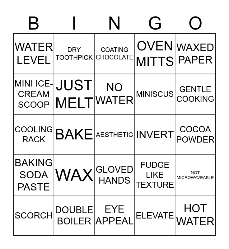 This bingo card has a free space and 24 words: WAX, DOUBLE BOILER, NO WATER, SCORCH, WAXED PAPER, WATER LEVEL, MINI ICE-CREAM SCOOP, DRY TOOTHPICK, INVERT, GLOVED HANDS, MINISCUS, COOLING RACK, FUDGE LIKE TEXTURE, NOT MICROWAVEABLE, JUST MELT, ELEVATE, COCOA POWDER, COATING CHOCOLATE, GENTLE COOKING, BAKE, HOT WATER, BAKING SODA PASTE, OVEN MITTS and EYE APPEAL.