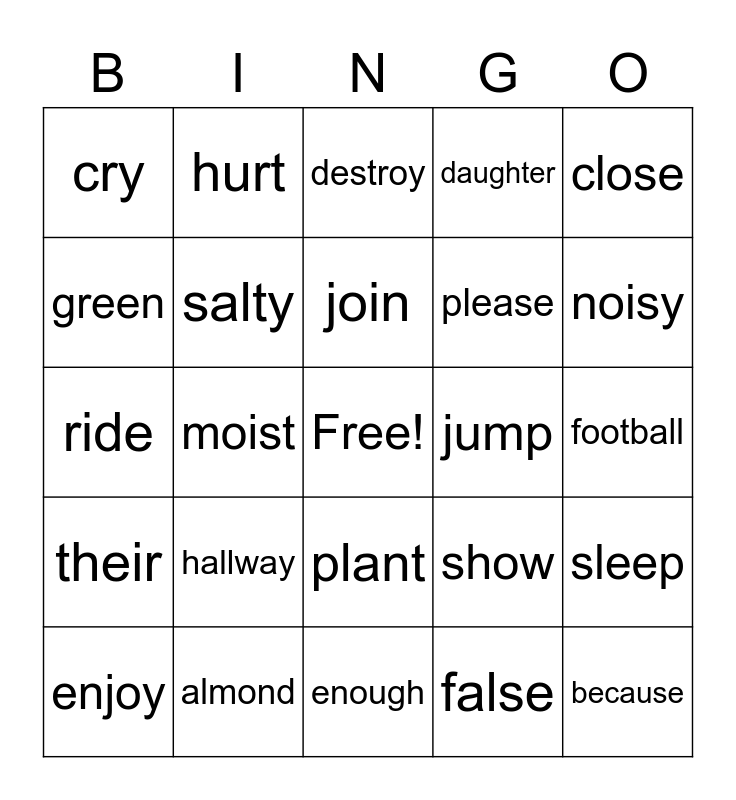 This bingo card has a free space and 24 words: hallway, almond, join, enjoy, close, cry, green, hurt, jump, plant, please, ride, show, sleep, salty, false, football, destroy, noisy, moist, because, their, daughter and enough.
