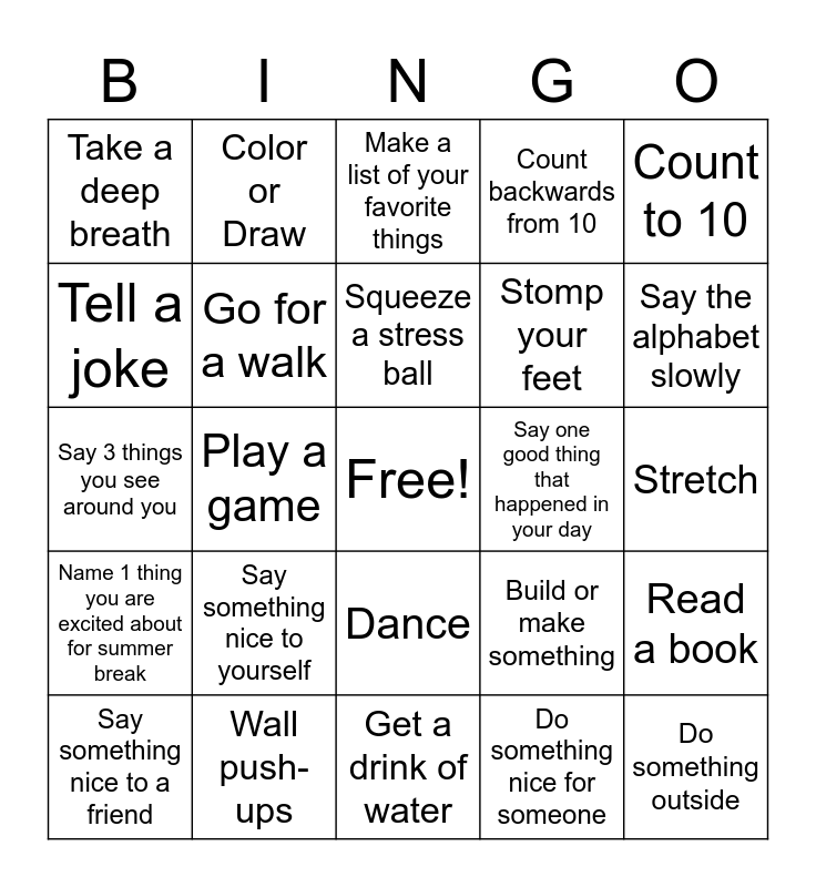 This bingo card has a free space and 24 words: Say something nice to yourself, Wall push-ups, Squeeze a stress ball, Say something nice to a friend, Count to 10, Take a deep breath, Tell a joke, Color or Draw, Say one good thing that happened in your day, Dance, Stomp your feet, Say 3 things you see around you, Build or make something, Read a book, Go for a walk, Do something nice for someone, Stretch, Make a list of your favorite things, Say the alphabet slowly, Play a game, Do something outside, Name 1 thing you are excited about for summer break, Count backwards from 10 and Get a drink of water.