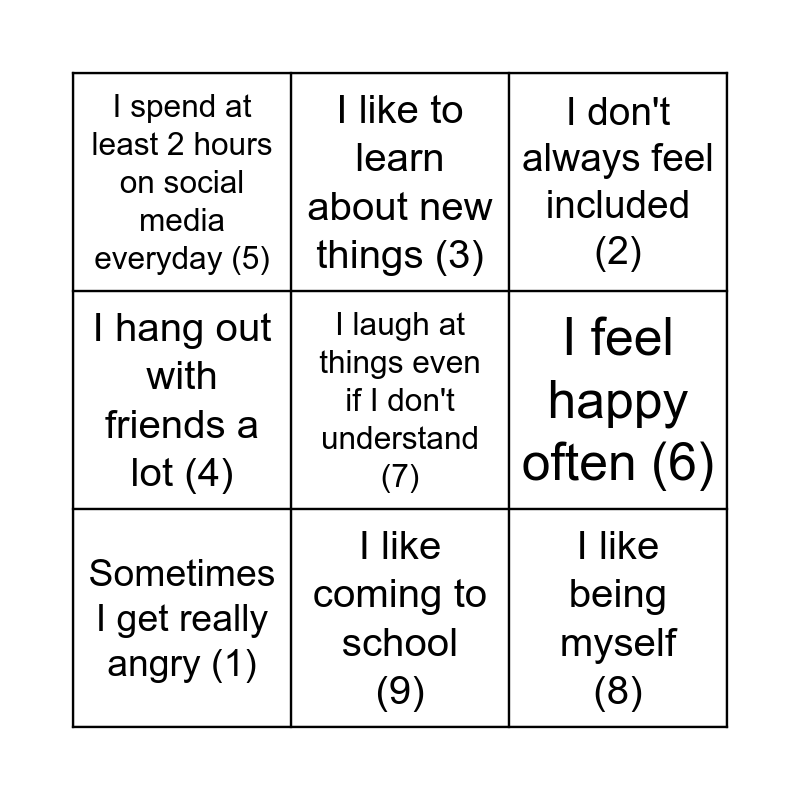 This bingo card has 9 words: Sometimes I get really angry (1), I don't always feel included (2), I like to learn about new things (3), I hang out with friends a lot (4), I spend at least 2 hours on social media everyday (5), I feel happy often (6), I laugh at things even if I don't understand (7), I like being myself (8) and I like coming to school (9).