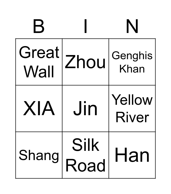 This bingo card has a free space and 8 words: Yellow River, Genghis Khan, Zhou, Shang, Great Wall, Han, XIA and Silk Road.