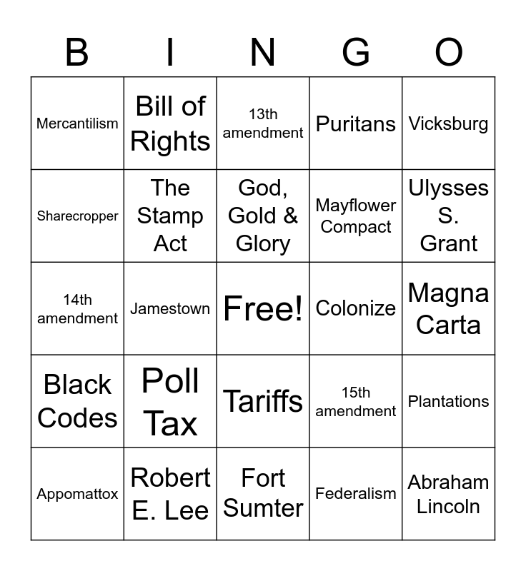 This bingo card has a free space and 24 words: Poll Tax, Robert E. Lee, God, Gold & Glory, Appomattox, Vicksburg, Mercantilism, Sharecropper, Bill of Rights, Colonize, Tariffs, Mayflower Compact, 14th amendment, 15th amendment, Plantations, The Stamp Act, Federalism, Magna Carta, 13th amendment, Ulysses S. Grant, Jamestown, Abraham Lincoln, Black Codes, Puritans and Fort Sumter.