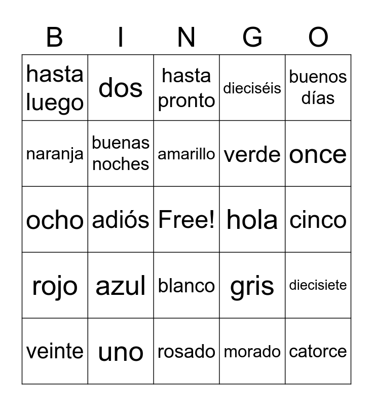 This bingo card has a free space and 24 words: azul, uno, amarillo, veinte, buenos días, hasta luego, naranja, dos, hola, blanco, verde, ocho, gris, diecisiete, buenas noches, morado, cinco, hasta pronto, once, adiós, catorce, rojo, dieciséis and rosado.