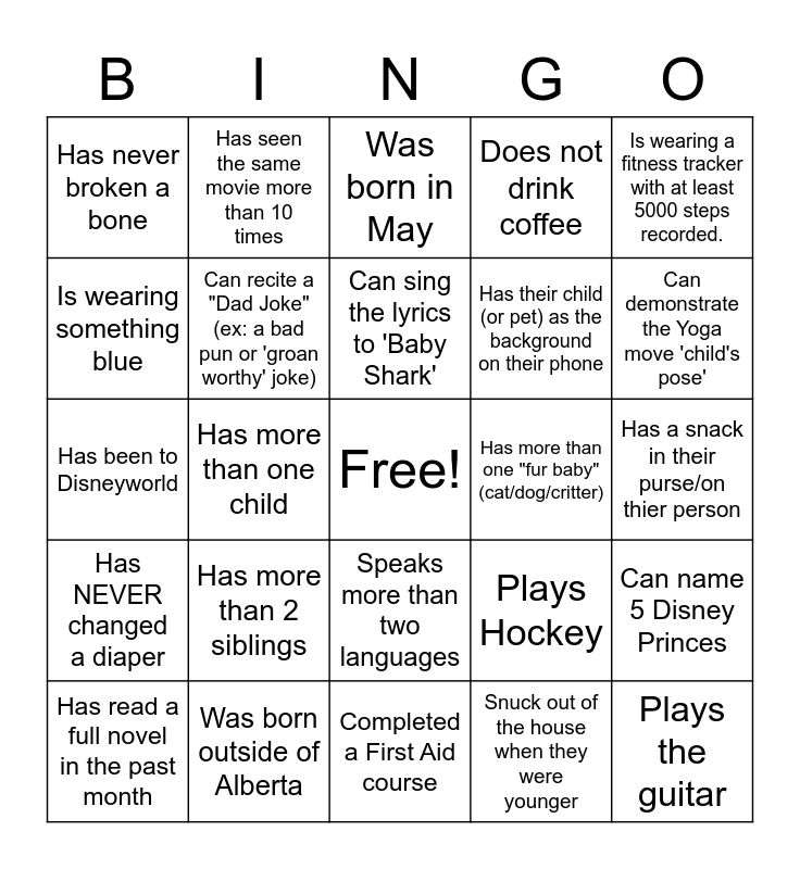 This bingo card has a free space and 24 words: Has more than 2 siblings, Was born outside of Alberta, Can sing the lyrics to 'Baby Shark', Has read a full novel in the past month, Is wearing a fitness tracker with at least 5000 steps recorded., Has never broken a bone, Is wearing something blue, Has seen the same movie more than 10 times, Has more than one "fur baby" (cat/dog/critter), Speaks more than two languages, Has their child (or pet) as the background on their phone, Has been to Disneyworld, Plays Hockey, Can name 5 Disney Princes, Can recite a "Dad Joke" (ex: a bad pun or 'groan worthy' joke), Snuck out of the house when they were younger, Has a snack in their purse/on thier person, Was born in May, Can demonstrate the Yoga move 'child's pose', Has more than one child, Plays the guitar, Has NEVER changed a diaper, Does not drink coffee and Completed a First Aid course.