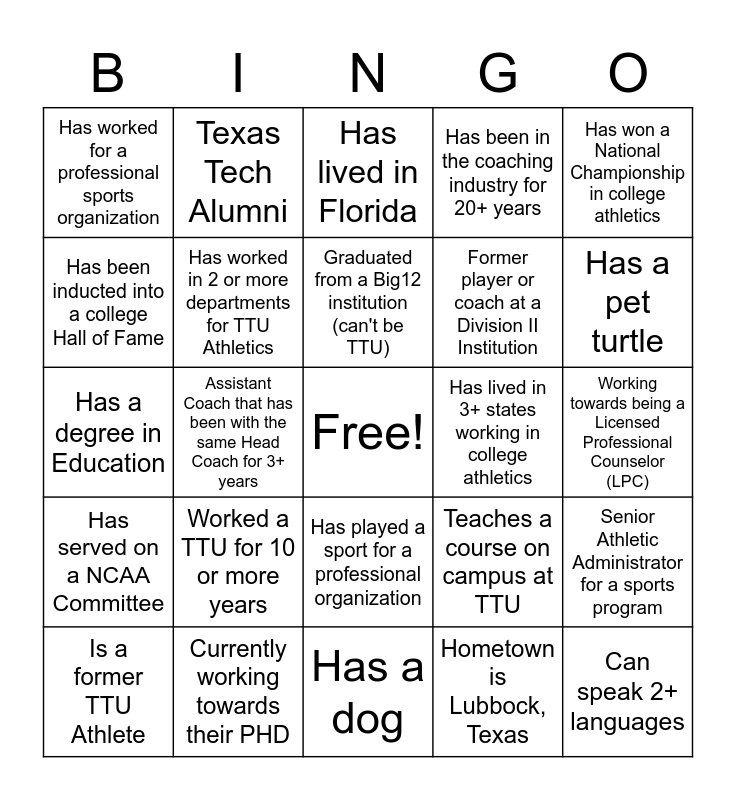 This bingo card has a free space and 24 words: Worked a TTU for 10 or more years, Currently working towards their PHD, Graduated from a Big12 institution (can't be TTU), Is a former TTU Athlete, Has won a National Championship in college athletics, Has worked for a professional sports organization, Has been inducted into a college Hall of Fame, Texas Tech Alumni, Has lived in 3+ states working in college athletics, Has played a sport for a professional organization, Former player or coach at a Division II Institution, Has a degree in Education, Teaches a course on campus at TTU, Senior Athletic Administrator for a sports program, Has worked in 2 or more departments for TTU Athletics, Hometown is Lubbock, Texas, Working towards being a Licensed Professional Counselor (LPC), Has lived in Florida, Has a pet turtle, Assistant Coach that has been with the same Head Coach for 3+ years, Can speak 2+ languages, Has served on a NCAA Committee, Has been in the coaching industry for 20+ years and Has a dog.