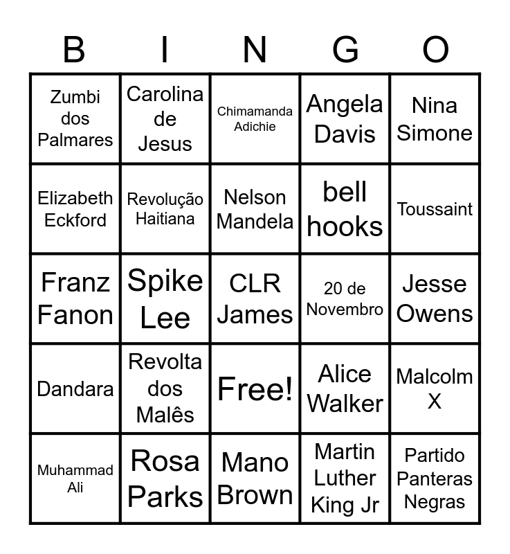 This bingo card has 26 words: Free!, Martin Luther King Jr, Nelson Mandela, Rosa Parks, Nina Simone, Zumbi dos Palmares, Elizabeth Eckford, Carolina de Jesus, Jesse Owens, Alice Walker, bell hooks, Franz Fanon, Malcolm X, Muhammad Ali, Spike Lee, Bob Marley, Angela Davis, Dandara, Chimamanda Adichie, CLR James, Toussaint, Mano Brown, 20 de Novembro, Revolta dos Malês, Revolução Haitiana and Partido Panteras Negras.