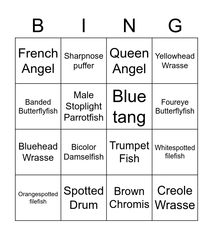 This bingo card has 22 words: Spotted Drum, Smooth Trunk fish, Sharpnose puffer, female Stoplight Parrotfish, Male Stoplight Parrotfish, Blue tang, French Angel, Queen Angel, Trumpet Fish, Creole Wrasse, Bluehead Wrasse, Yellowhead Wrasse, Schoolmaster, Black Margate, Brown Chromis, Peacock Flounder, Whitespotted filefish, Orangespotted filefish, Bicolor Damselfish, Banded Butterflyfish, Foureye Butterflyfish and Harlequin Bass.