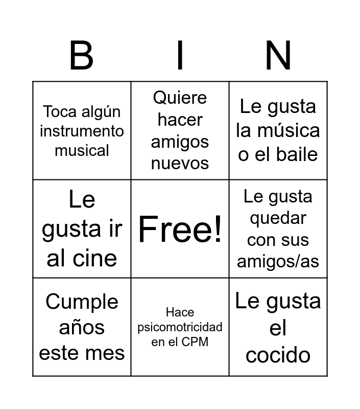 This bingo card has a free space and 9 words: Cumple años este mes, Le gusta la música o el baile, Quiere hacer amigos nuevos, Le gusta ir al cine, Toca algún instrumento musical, Le gusta quedar con sus amigos/as, Le gusta el cocido, Nació en Valladolid and Hace psicomotricidad en el CPM.
