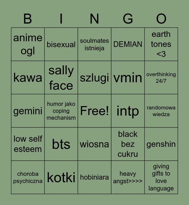 This bingo card has a free space and 24 words: bts, kotki, szlugi, choroba psychiczna, earth tones <3, anime ogl, kawa, bisexual, intp, wiosna, vmin, gemini, black bez cukru, genshin, sally face, heavy angst>>>>, randomowa wiedza, soulmates istnieja, overthinking 24/7, humor jako coping mechanism, giving gifts to love language, low self esteem, DEMIAN and hobiniara.