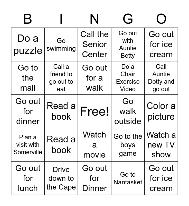 This bingo card has a free space and 24 words: Read a book, Drive down to the Cape, Go out for a walk, Go out for lunch, Go out for ice cream, Do a puzzle, Go to the mall, Go swimming, Go walk outside, Watch a movie, Do a Chair Exercise Video, Go out for dinner, Go to the boys game, Watch a new TV show, Call a friend to go out to eat, Go to Nantasket, Color a picture, Call the Senior Center, Call Auntie Dotty and go out, Read a book, Go out for ice cream, Plan a visit with Somerville, Go out with Auntie Betty and Go out for Dinner.