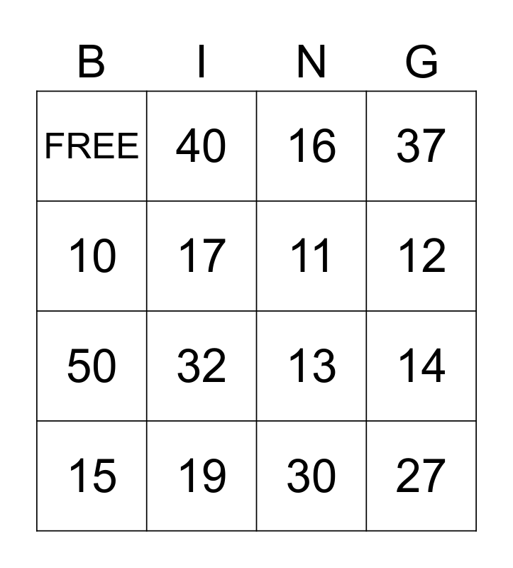 This bingo card has 25 words: 25, 16, 12, 32, 10, FREE, 17, 40, 19, 18, 50, 13, 14, 15, 11, 12, 30, 16, 32, 14, 15, 11, 27, 37 and 57.