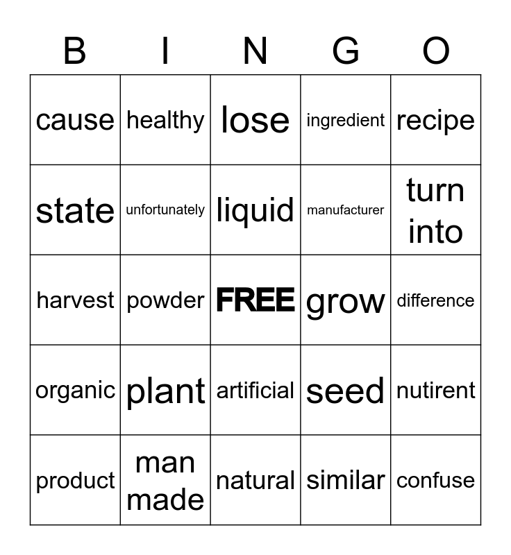 This bingo card has a free space and 24 words: product, plant, liquid, similar, recipe, cause, healthy, lose, grow, difference, harvest, unfortunately, seed, nutirent, state, man made, natural, ingredient, turn into, organic, powder, artificial, manufacturer and confuse.