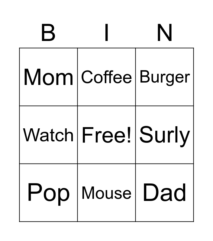 This bingo card has a free space and 8 words: Surly, Burger, Coffee, Pop, Mom, Dad, Watch and Mouse.