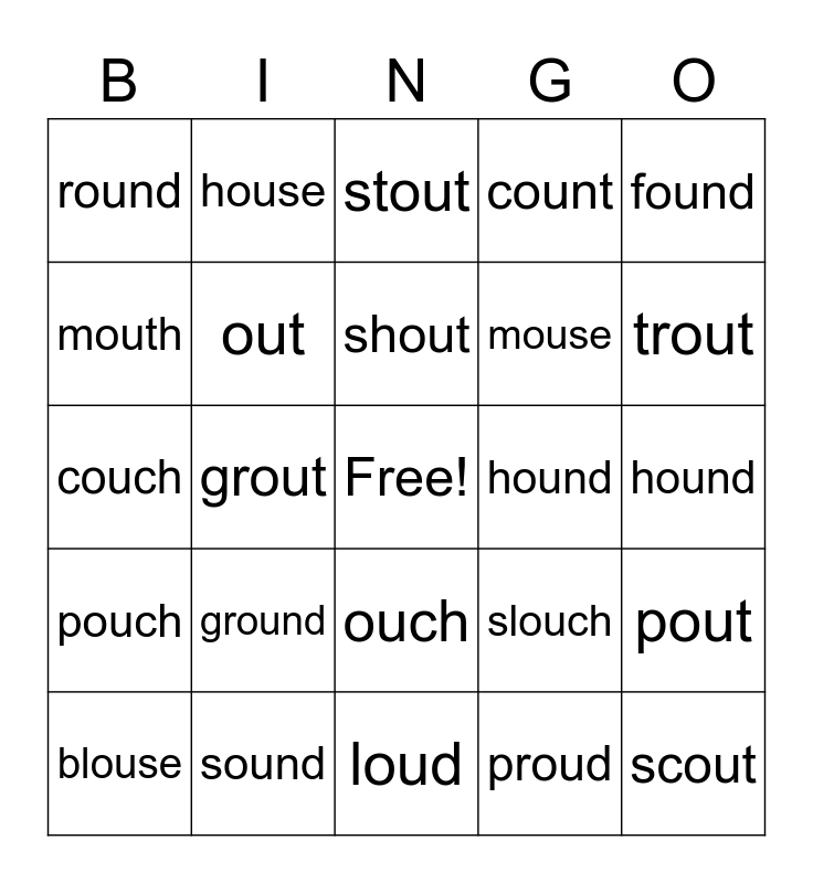 This bingo card has a free space and 26 words: ouch, proud, shout, sound, found, round, mouth, house, hound, slouch, mouse, couch, pout, blouse, grout, pound, count, pouch, stout, scout, trout, loud, hound, ground, out and cloud.