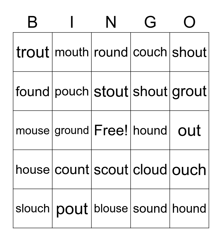 This bingo card has a free space and 28 words: ouch, proud, shout, sound, found, round, mouth, house, hound, slouch, mouse, couch, pout, blouse, grout, pound, count, pouch, stout, scout, trout, loud, hound, ground, out, cloud, shout and proud.