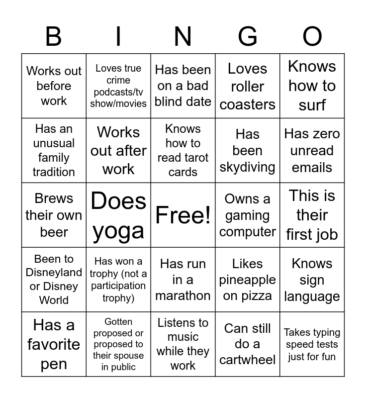 This bingo card has a free space and 25 words: Has won a trophy (not a participation trophy), Listens to music while they work, Knows how to read tarot cards, Has a favorite pen, Knows how to surf, Works out before work, Has an unusual family tradition, Loves true crime podcasts/tv show/movies, Owns a gaming computer, Has run in a marathon, Has been skydiving, Brews their own beer, Likes pineapple on pizza, Knows sign language, Works out after work, Has a nickname, This is their first job, Has been on a bad blind date, Has zero unread emails, Does yoga, Takes typing speed tests just for fun, Gotten proposed or proposed to their spouse in public, Been to Disneyland or Disney World, Loves roller coasters and Can still do a cartwheel.