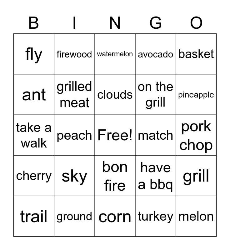 This bingo card has a free space and 24 words: sky, ground, clouds, trail, basket, fly, ant, firewood, match, bon fire, on the grill, take a walk, have a bbq, grill, grilled meat, turkey, pork chop, watermelon, pineapple, peach, melon, cherry, avocado and corn.