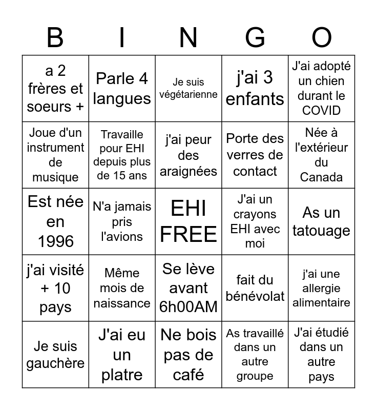 This bingo card has a free space and 24 words: Même mois de naissance, J'ai eu un platre, j'ai peur des araignées, Je suis gauchère, J'ai adopté un chien durant le COVID, a 2 frères et soeurs +, Joue d'un instrument de musique, Parle 4 langues, J'ai un crayons EHI avec moi, Se lève avant 6h00AM, Porte des verres de contact, Est née en 1996, fait du bénévolat, j'ai une allergie alimentaire, Travaille pour EHI depuis plus de 15 ans, As travaillé dans un autre groupe, As un tatouage, Je suis végétarienne, Née à l'extérieur du Canada, N'a jamais pris l'avions, J'ai étudié dans un autre pays, j'ai visité + 10 pays, j'ai 3 enfants and Ne bois pas de café.