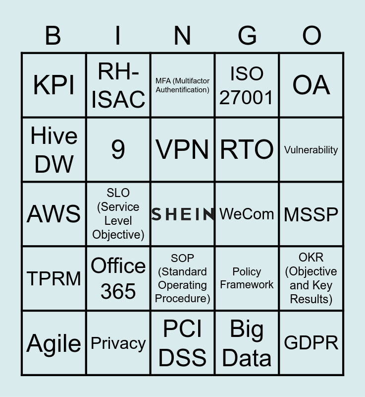 This bingo card has a free space and 34 words: STL, Big Data, GSRM, GRC, TPRM, 9, OA, Agile, RH-ISAC, SDC, VPN, MFA (Multifactor Authentification), Malware, WAF (Web Application Firewall), WeCom, Vulnerability, Privacy, AWS, Office 365, Policy Framework, SOP (Standard Operating Procedure), NIST, KPI, MSSP, PCI DSS, GDPR, ISO 27001, BIA, RTO, Hive DW, Real- Time Data, SLO (Service Level Objective), OKR (Objective and Key Results) and GCP (Google Cloud Platform).