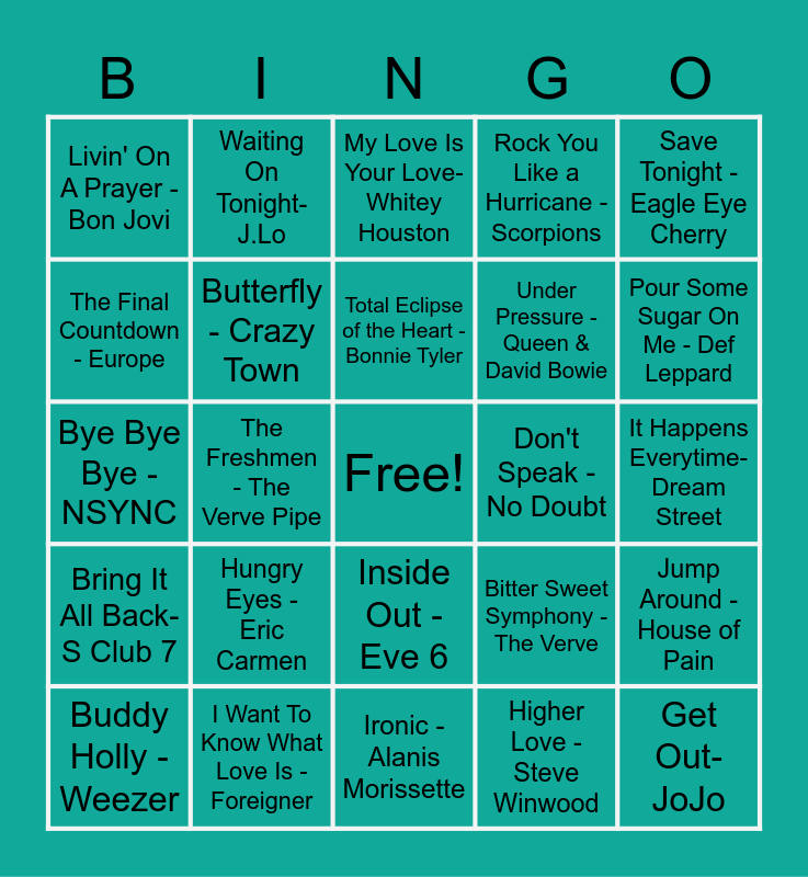 This bingo card has a free space and 95 words: I Wanna Dance With Somebody - Whitney Houston, Free Fallin' - Tom Petty, Higher Love - Steve Winwood, Dancing in the Dark - Bruce Springsteen, What's Love Got To Do With It - Tina Turner, Billie Jean - Michael Jackson, Every Breath You Take - The Police, I Want To Know What Love Is - Foreigner, Never Gonna Give You Up - Rick Astley, Here I Go Again - Whitesnake, Africa - Toto, Girls Just Want To Have Fun - Cyndi Lauper, Don't Stop Believing - Journey, Total Eclipse of the Heart - Bonnie Tyler, In The Air Tonight - Phil Collins, Livin' On A Prayer - Bon Jovi, Pour Some Sugar On Me - Def Leppard, Wake Me Up Before You Go Go - Wham!, It's Tricky - Run DMC, Eye of the Tiger - Survivor, I Love Rock n Roll - Joan Jett, You Spin Me Round - Dead or Alive, I'm So Excited - The Pointer Sisters, Jesse's Girl - Rick Springfield, Rock You Like a Hurricane - Scorpions, The Final Countdown - Europe, Don't You Forget About Me - Simple Minds, Under Pressure - Queen & David Bowie, We Built This City - Starship, Heaven is a Place On Earth - Belinda Carlisle, Hungry Eyes - Eric Carmen, Jump - Van Halen and Straight Up - Paula Abdul, Semi- Charmed Life - Third Eye Blind, Breakfast at Tiffany's - Deep Blue Something, Buddy Holly - Weezer, I Want It That Way - Backstreet Boys, Ironic - Alanis Morissette, I'll Be There For You - The Rembrandts, Bye Bye Bye - NSYNC, Truly Madly Deeply - Savage Garden, Jump Around - House of Pain, The Freshmen - The Verve Pipe, Inside Out - Eve 6, Save Tonight - Eagle Eye Cherry, Bitter Sweet Symphony - The Verve, Don't Speak - No Doubt, Wannabe - Spice Girls, No Scrubs - TLC, Torn - Natalie Imbruglia, U Can't Touch This - MC Hammer, Baby One More Time - Britney Spears, MMMBop - Hanson, Barbie Girl - Aqua, Genie in a Bottle - Christina Aguilera, Who Let The Dogs Out - Baha Men, Gettin' Jiggy With It - Will Smith, Livin' la Vida Loca - Rickie Martin, Mambo No. 5 - Lou Bega, Aaron's Party - Aaron Carter, Push It - Salt-N-Pepa, Butterfly - Crazy Town, Hero - Mariah Carey, It Takes Two - Rob Base & DJ EZ Rock, Say my name- Destiny's Child, Maria Maria - Santana, Higher- Creed, Never Let You Go- Third Eye Blind, The Real Slim Shady- Eminem, My Love Is Your Love- Whitey Houston, Oops!...I Did It Again - Britney Spears, Otherside- Red Hot Chili Peppers, With You- Jessica Simpson, Get Out- JoJo, Goodies- Ciera ft. Petey Pablo, Tearin Up My Heart- *NSYNC, Pieces Of Me- Ashlee Simpson, Are You Happy Now?- Michelle Branch, How You Remind Me- Nickleback, Kryptonite- Three Doors Down, Waiting On Tonight- J.Lo, Here In Your Arms- Hellogoodbye, Get Low- Lil Jon, Laffy Taffy- D4L, Just The Girl - The Click Five, It Happens Everytime- Dream Street, Bring It All Back- S Club 7, Scars- Papa Roach, Usher- Yeah, Snap Yo Fingers- Lil Jon, Get Low- Lil Jon & the east side boyz, On The Way Down- Ryan Cabrera, All you wanted- michelle branch, Why can't I - Liz Phair, Larger Than Life- Backstreet Boys and Back Here- BBMac.